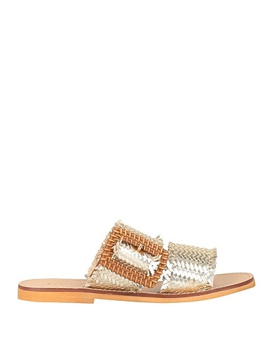 sandals, leather, metallic, plain colour, no appliqués, leather lining, buckle fastening, round toe, flat, rubber sole, contains non-textile parts of animal origin