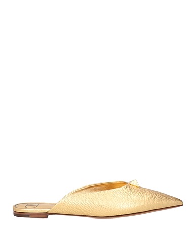 textured leather, metallic, studs, plain colour with appliqués, leather lining, pointed toe, flat, leather/rubber sole, contains non-textile parts of animal origin, mules