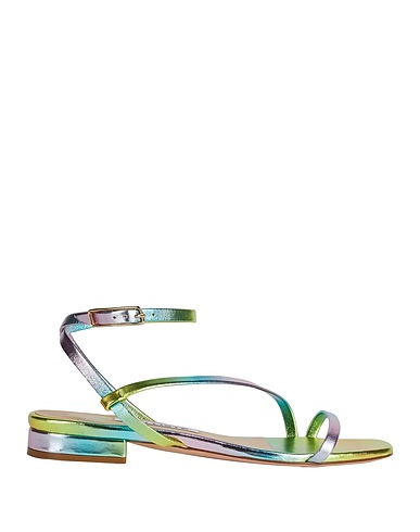 ankle strap sandals, leather, metallic, no appliqués, multicolour, leather lining, buckle-fastening ankle strap, round toe, flat, leather sole, contains non-textile parts of animal origin