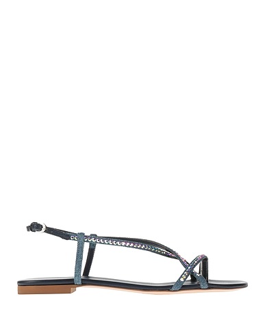 toe strap sandals, denim, plain colour with appliqués, crystals, leather lining, buckle-fastening ankle strap, round toe, flat, leather/rubber sole, contains non-textile parts of animal origin