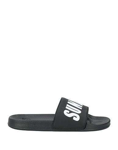 pool slides, rubber, two-tone, brand logo, fabric inner, round toe, flat, rubber sole