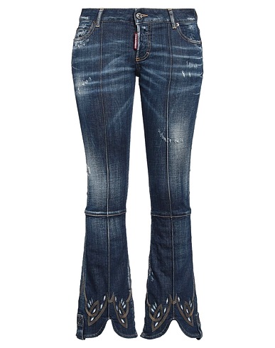 boot-cut jeans, denim, faded, distressed, stretchy fabric, plain colour with appliqués, brand logo, embroidered, medium wash, low waisted, belt loops, regular fit, concealed button fastenings, pockets, machine wash or dry clean, do not tumble dry, contains non-textile parts of animal origin