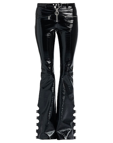 flared trousers, coated fabric, patent-effect, plain colour, strap detailing, high waisted, belt loops, regular fit, buckle fastening, zip fastening, multipockets, stretch, do not wash, do not bleach, do not tumble dry