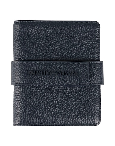 wallet, pebbled-leather, plain colour with appliqués, strap detailing, brand logo, snap fastenings, card slots, internal zip pocket, contains non-textile parts of animal origin
