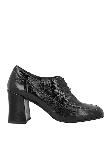 lace-up shoes, patent leather, brand logo, plain colour, leather lining, round toe, square heel, rubber sole, contains non-textile parts of animal origin