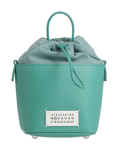 bucket bag, pebbled-leather, canvas, plain colour, brand logo, drawstring fastening, fully lined, internal pocket, detachable top handle, detachable shoulder strap, metallic straps, feet at base, small size, contains non-textile parts of animal origin