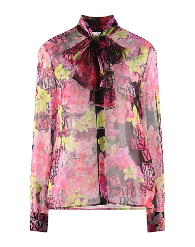 bow shirt, crepe, brand logo, floral-print, bow-tie neckline, long sleeves, buttoned cuffs, button fastenings, no pockets