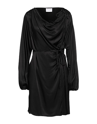 satin, wrap-effect, plain colour, draped neckline, long sleeves, unlined, tie fastening, without pockets, machine wash or dry clean, do not bleach, do not tumble dry, flared dress