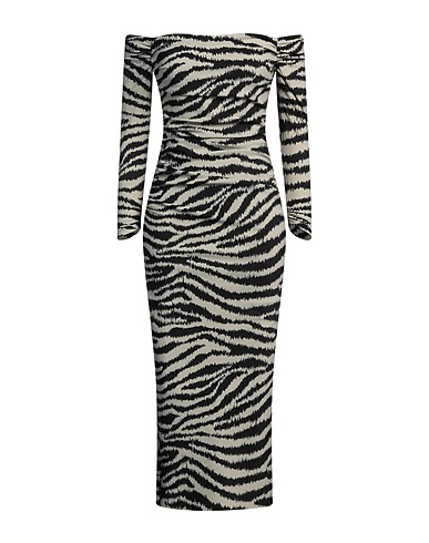bodycon dress, synthetic jersey, zebra-print, no appliqués, off-the-shoulder, 3/4 length sleeves, rear slit, stretch, machine wash or dry clean, do not tumble dry