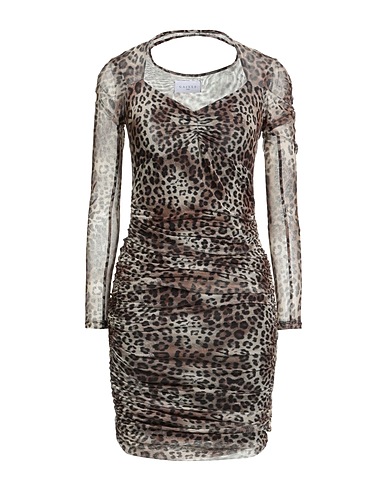 bodycon dress, synthetic jersey, stretchy fabric, leopard-print, gathered, crewneck, long sleeves, fully lined, machine wash or dry clean, do not bleach, do not tumble dry