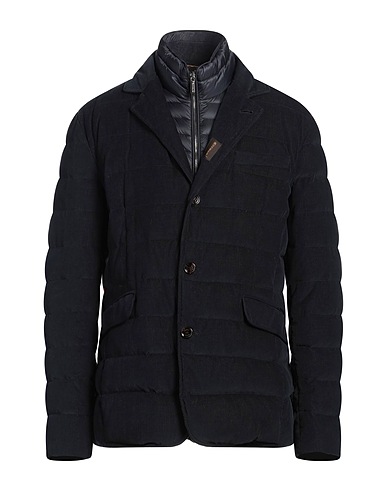 down jacket, corduroy, quilted, brand logo, plain colour, mock neck, long sleeves, goose down interior, heavyweight padding, zip fastening, button fastenings, multipockets, contains non-textile parts of animal origin, hand wash or dry clean, do not bleach, do not tumble dry