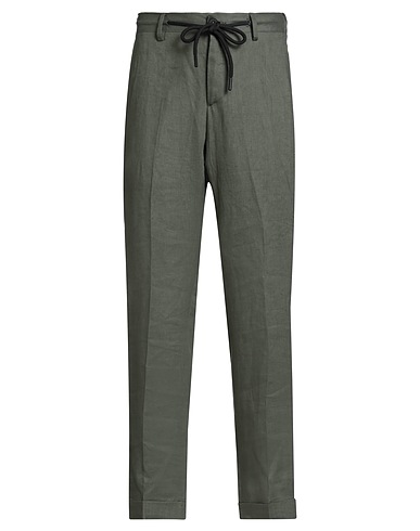 casual trousers, linen, plain colour, no appliqués, mid rise, drawstring waist, tapered leg, regular fit, zip fastening, 1 button, slit pockets, welt pockets, dry clean, do not bleach, do not tumble dry
