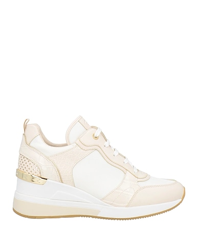 low-top trainers, synthetic material, shell, two-tone, brand logo, lace-up, round toe, wedge, rubber sole, fabric inner