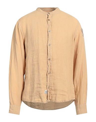 тканое полотно, логотип бренда, одноцветное изделие, воротник-стойка, длинные рукава, застёжка в виде пуговиц, без карманов, приталенная рубашка