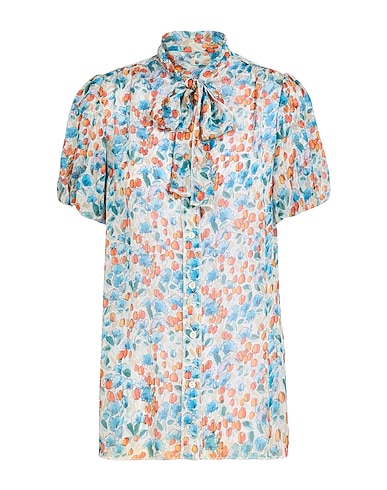 рубашка с бантом, шифон, цветочный рисунок, без аппликаций, короткие рукава, застёжка в виде пуговиц, ручная стирка или химчистка, нельзя отбеливать, нельзя выжимать и сушить в стиральной машине