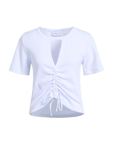 футболка, джерси в рубчик, эластичная ткань, одноцветное изделие, сборки, логотип бренда, круглая горловина, короткие рукава, машинная стирка, нельзя отбеливать, нельзя выжимать и сушить в стиральной машине