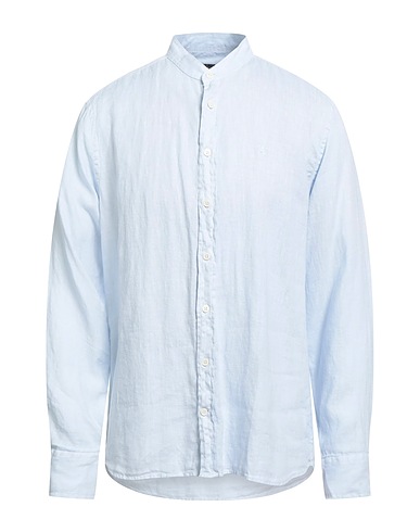 приталенная рубашка, лен, одноцветное изделие, вышитый логотип, воротник-стойка, длинные рукава, манжеты на пуговицах, застёжка в виде пуговиц, машинная стирка или химчистка, нельзя отбеливать, нельзя выжимать и сушить в стиральной машине, этот бренд предлагает большемерные модели