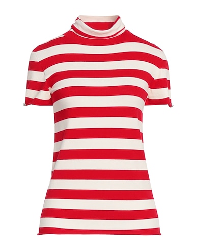 вязаное изделие, легкий трикотаж, логотип бренда, стразы, в полоску, высокий воротник, короткие рукава, без карманов