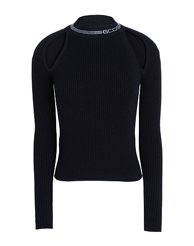 вязаное изделие, узор "в рубчик", легкий трикотаж, логотип бренда, стразы, однотонная модель с декором, круглая горловина, длинные рукава, без карманов