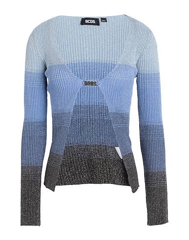 вязаное изделие, ламе, легкий трикотаж, логотип бренда, разноцветный узор, глубокий вырез горловины, длинные рукава, застежки-крючки, без карманов