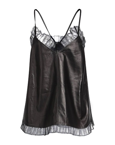 camisole, leather, solid color, brand logo, lace trims, deep neckline, sleeveless, fully lined, contains non-textile parts of animal origin, dry clean, do not tumble dry, this brand runs small