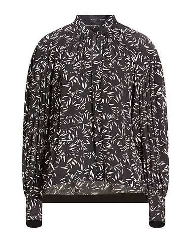 top, crepe, two-tone, no appliqués, mandarin collar, long sleeves, snap-fastening cuffs, button fastenings, dry clean, do not bleach, do not tumble dry