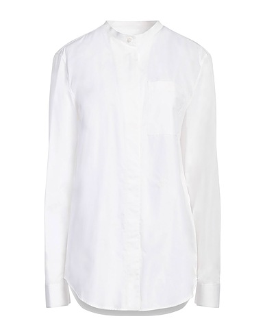 shirt, poplin, solid color, brand logo, embroidered, mandarin collar, long sleeves, buttoned cuffs, button fastenings, one chest pocket, dry clean, do not bleach, do not tumble dry