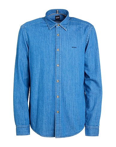 denim, embroidered logo, solid color, medium wash, classic collar, long sleeves, buttoned cuffs, button fastenings, machine wash or dry clean, do not bleach, do not tumble dry