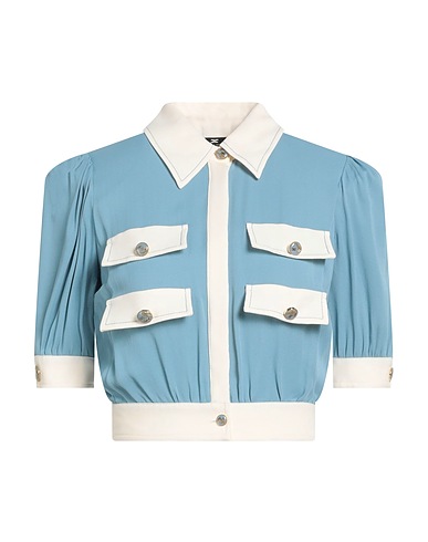 shirt, crepe, two-tone, brand logo, classic collar, short sleeves, shoulder pads, button fastenings, decorative pockets, dry clean, do not bleach, do not tumble dry, this brand runs small