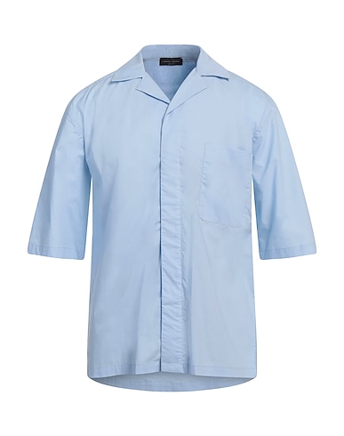 regular-fit shirt, poplin, solid color, no appliqués, camp collar, short sleeves, concealed button fastenings, one chest pocket, dry clean, do not bleach, do not tumble dry, this brand runs large