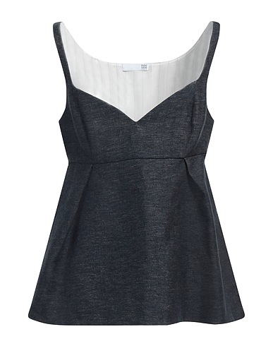 top, denim, solid color, no appliqués, deep neckline, sleeveless, zipper fastening, dry clean, do not bleach, do not tumble dry