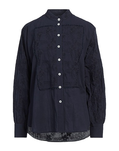 shirt, woven, solid color with appliqués, embroidered, brand logo, mandarin collar, long sleeves, buttoned cuffs, button fastenings, hand wash or dry clean, do not bleach, do not tumble dry