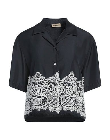 shirt, satin, solid color with appliqués, lace trims, classic collar, short sleeves, button fastenings, dry clean, do not bleach, do not tumble dry