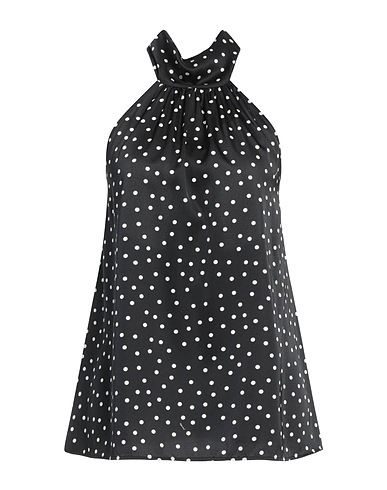 top, satin, polka-dot, no appliqués, bow-tie neckline, sleeveless, stretch, machine wash or dry clean, do not bleach, do not tumble dry