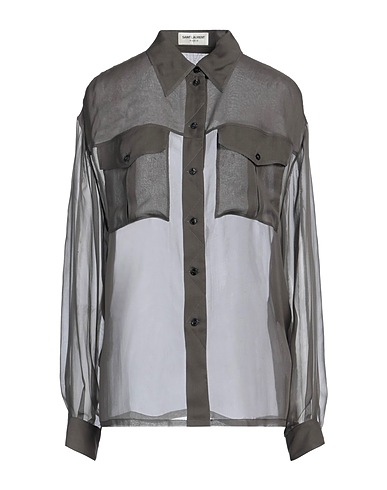 safari shirt, crepe, solid color, no appliqués, classic collar, long sleeves, button fastenings, two chest pockets, contains non-textile parts of animal origin, dry clean, do not bleach, do not tumble dry