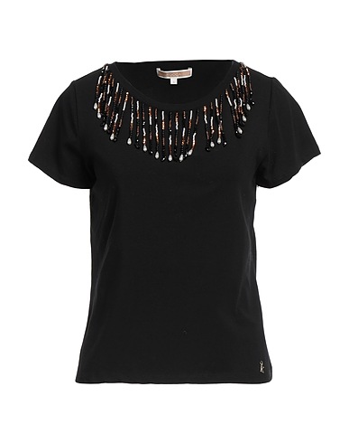 t-shirt, jersey, solid color with appliqués, beads, brand logo, crewneck, short sleeves, stretch, hand wash, do not bleach, do not tumble dry