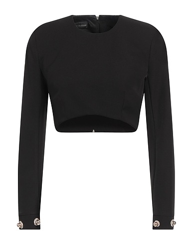 crop top, crepe, solid color with appliqués, embellished, crewneck, long sleeves, zipper fastening, stretch, machine wash, do not bleach, do not tumble dry