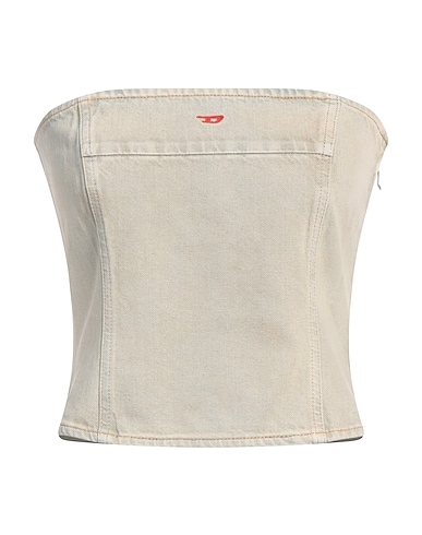 tube top, denim, faded, solid color, embroidered logo, light wash, deep neckline, zipper fastening, hand wash, do not bleach, do not tumble dry