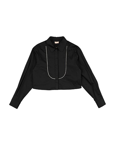 poplin, solid color with appliqués, crystals, embroidered logo, classic collar, long sleeves, buttoned cuffs, button fastenings, stretchy fabric, hand wash or dry clean, do not bleach, do not tumble dry, this brand runs small