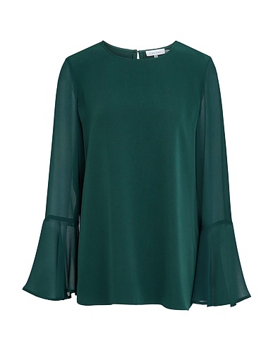 top, crepe, solid color, no appliqués, crewneck, long sleeves, 1 button, stretch, dry clean, do not bleach, do not tumble dry