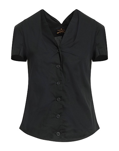 shirt, woven, solid color, no appliqués, v-neck, short sleeves, button fastenings, stretch