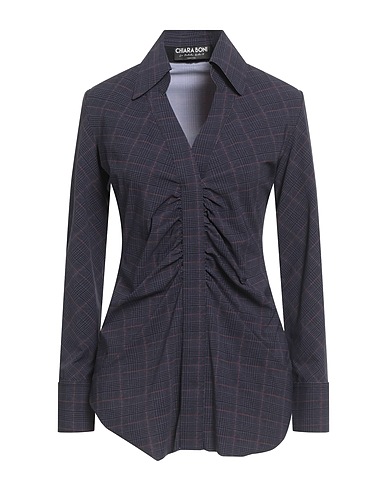 scuba, glen plaid, gathered, camp collar, long sleeves, stretch, machine wash or dry clean, do not bleach, do not tumble dry