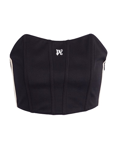 corset, crepe, solid color with appliqués, embroidered logo, side seam stripes, strapless, internal boning, hook fastenings, zipper fastening, stretch, hand wash, do not bleach, do not tumble dry