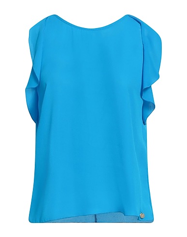 ruched top, crepe, solid color, brand logo, crewneck, sleeveless, machine wash, do not bleach, do not tumble dry