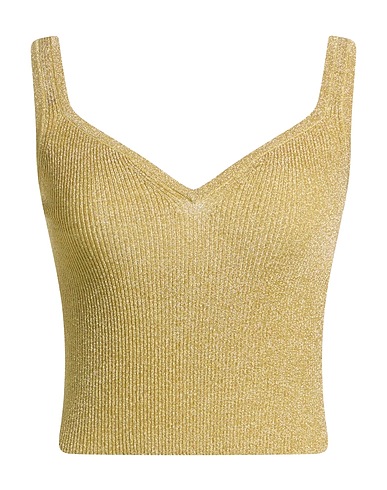 crop top, knitted, metallic, stretchy fabric, lightweight knit, solid color, no appliqués, deep neckline, sleeveless, dry clean, do not bleach, do not tumble dry
