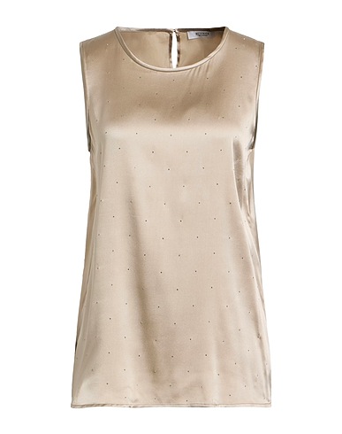 top, satin, stretchy fabric, solid color with appliqués, crystals, crewneck, sleeveless, 1 button, hand wash or dry clean, do not bleach, do not tumble dry