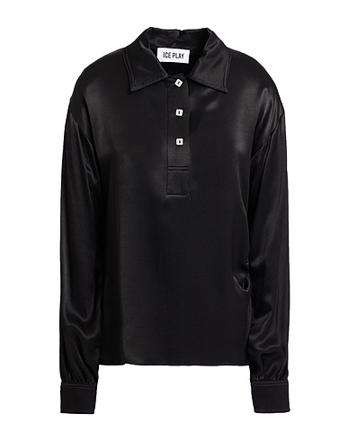 top, satin, solid color, brand logo, buttoned neckline, long sleeves, buttoned cuffs, dry clean, do not bleach, do not tumble dry