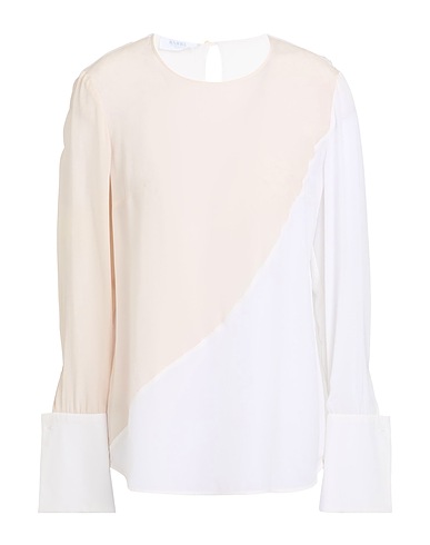 top, crepe, two-tone, no appliqués, crewneck, long sleeves, 1 button, hand wash or dry clean, do not bleach, do not tumble dry