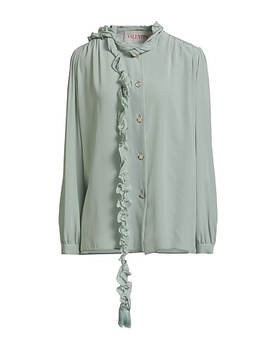 ruched shirt, cady, solid color with appliqués, ruffles, mandarin collar, long sleeves, buttoned cuffs, button fastenings, contains non-textile parts of animal origin, dry clean, do not bleach, do not tumble dry, be the best-dressed bridesmaid or wedding guest with this designer piece, perfect for any ceremony