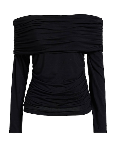 off-the-shoulder top, jersey, stretchy fabric, solid color, gathered, long sleeves, machine wash, do not bleach, do not tumble dry
